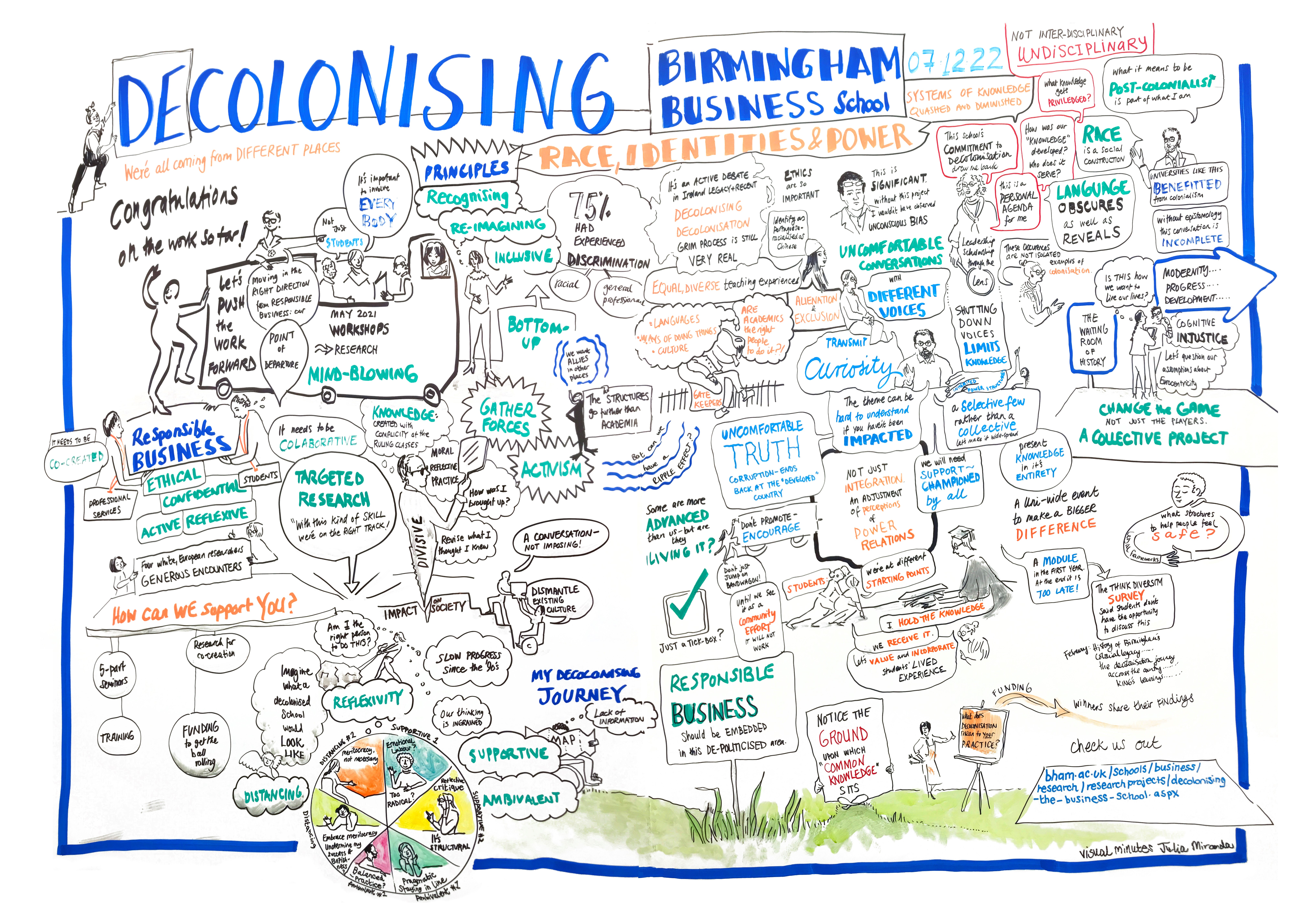 What role does colonisation play within a business school environment? December 2022 marked the official launch of the three-year Decolonisation Project at Birmingham Business School. To commemorate the occasion, and in the spirit of the project to explore arts-based methodologies as research practice, London-based illustrator and artist, Julia Miranda came to document the event through visual…