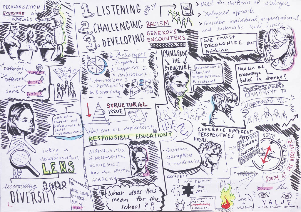 December 2022 marked the official launch of the three-year Decolonisation Project at Birmingham Business School. To commemorate the occasion, and in the spirit of the project to explore arts-based methodologies as research practice, London-based illustrator and artist, Julia Miranda came to document the event through visual minutes. Acting as both a point of departure for individual conversations, discussions, explorations and reflections into personal journeys to decolonise our own practices, as well as a reminder of the project and the commitment made to continue the work to decolonise the Business School during the launch. Julia generously offered an afternoon’s mentorship and training for a BBS student to create their own visual minutes of the event. Alongside Julia’s work, we have visual minutes created by Felicity Porter, a visiting student, studying Marketing and Management.